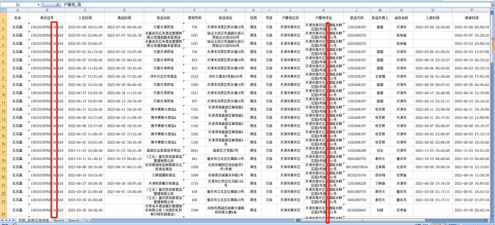 查询个人开房记录及同住人信息